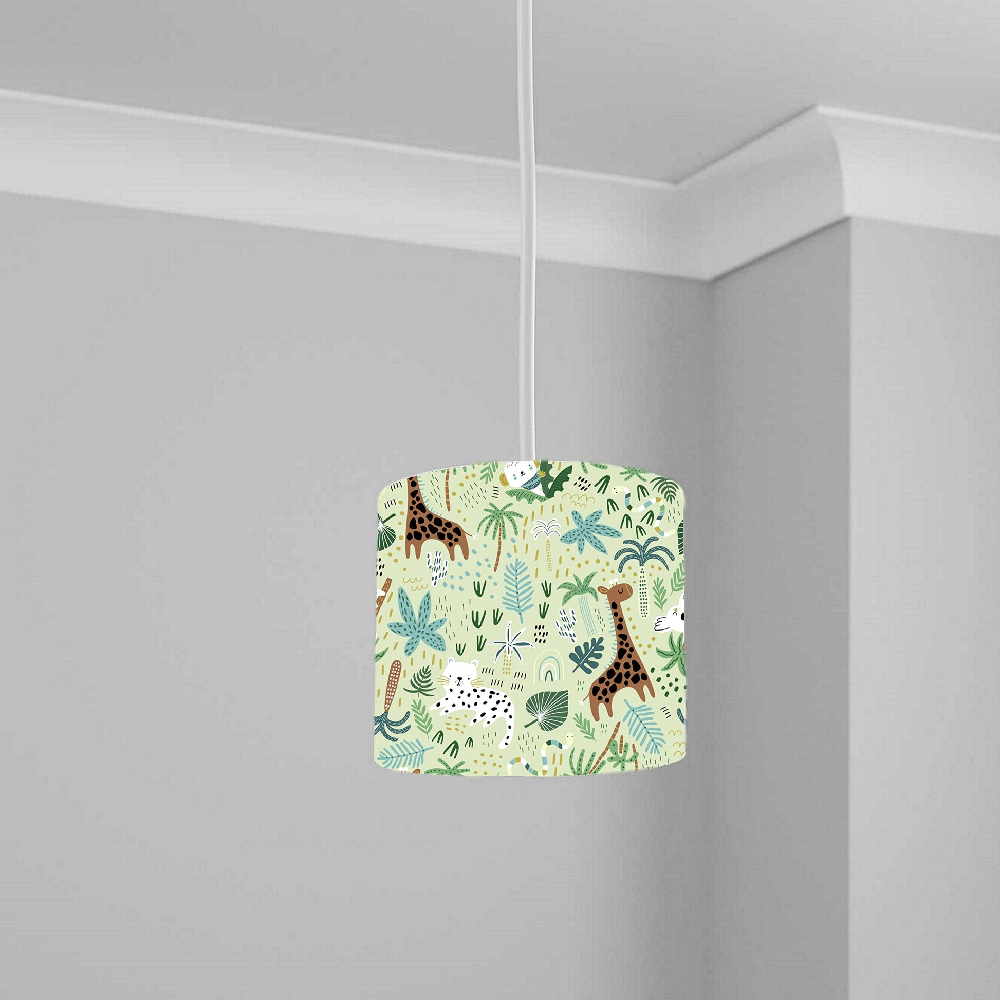 Transform your nursery into a vibrant jungle safari with this charming ceiling lampshade. Featuring playful giraffes, leopards, and lush greenery, this lightshade is designed to captivate and inspire young imaginations. Crafted to fit seamlessly into your nursery decor, its soft, ambient glow creates a cozy atmosphere perfect for story time or bedtime. The durable construction ensures long-lasting use, while the easy installation makes it a convenient choice for busy parents. Let your child's room become a haven of adventure and wonder with this delightful jungle-themed lampshade.