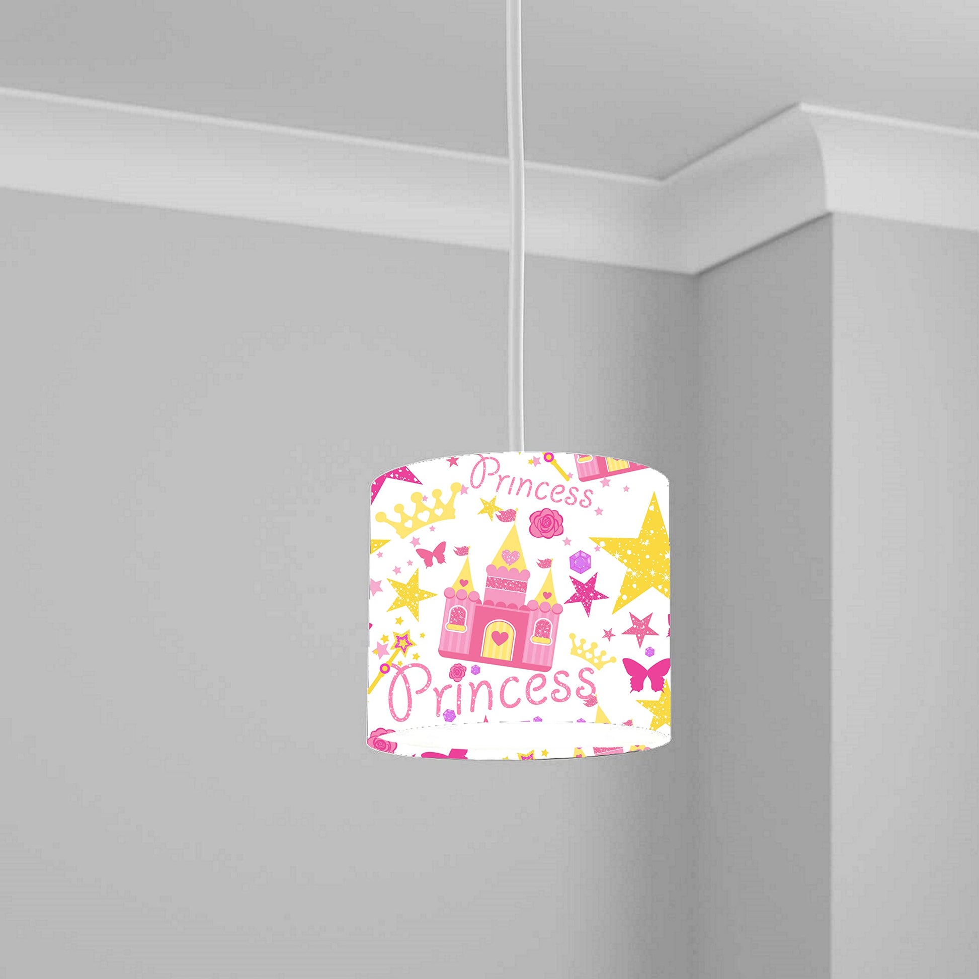 Transform your nursery into a magical kingdom with this Pink Princess Castle Ceiling Lampshade Lightshade. Featuring enchanting castles, crowns, and stars, this lampshade is perfect for creating a dreamy ambiance in your little one's room. The vibrant pink and yellow design adds a pop of color, while the 20cm x 18.5cm size is ideal for cozy nurseries. Easy to install, it fits standard ceiling lights, making it a quick and stylish update to any child's space. Bring the fairy tale to life with this charming nursery accessory.