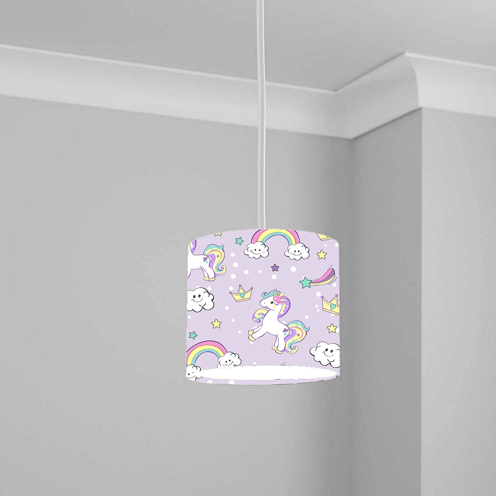 Transform your child's room into a whimsical wonderland with our Magical Unicorn Rainbow Ceiling Lampshade Lightshade. This enchanting light fixture features a delightful unicorn and rainbow design set against a soft lavender background, perfect for creating a dreamy atmosphere in any kid's space. Sized at 20cm x 18.5cm, this lampshade fits seamlessly into most standard ceiling light fittings, adding a touch of magic to your home decor. The vibrant colors and playful patterns not only illuminate the room but also spark imagination and joy. Easy to install and maintain, this lampshade is the ideal choice for parents looking to add a charming and functional element to their children's rooms. Brighten up your little one's day with this captivating ceiling lampshade that brings stories and dreams to life.