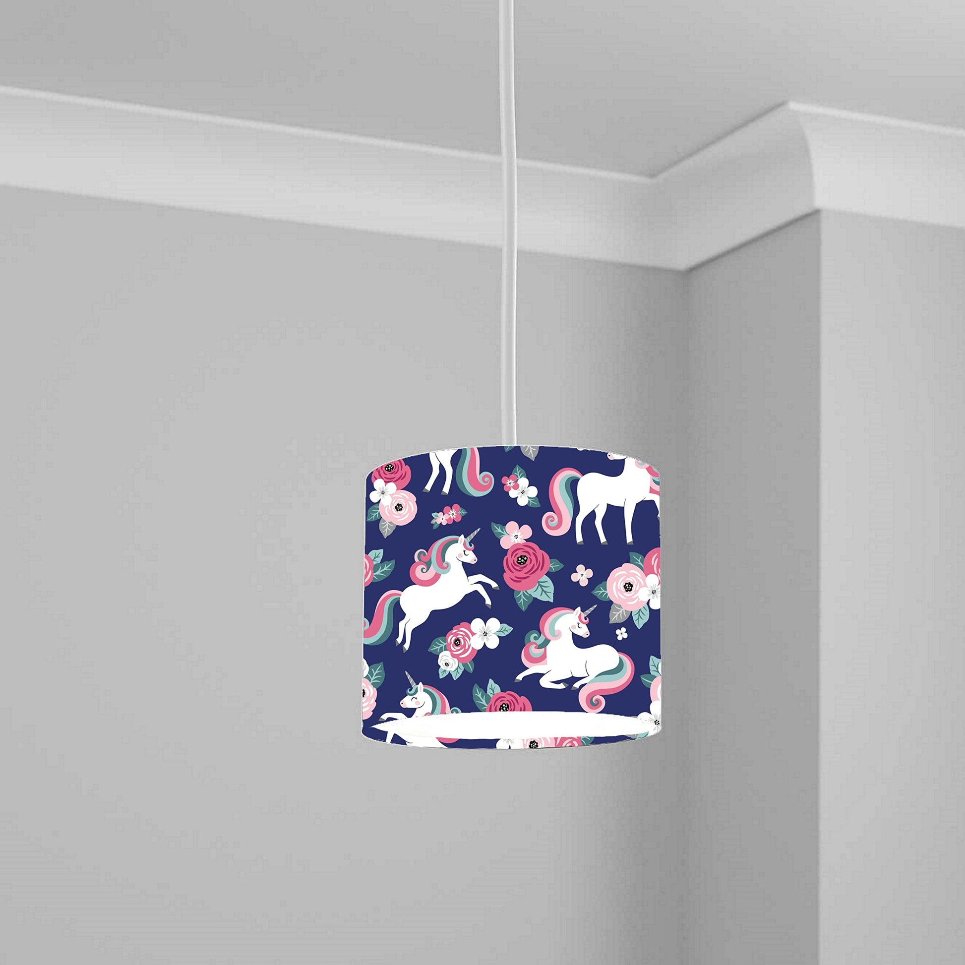 Transform your room into a whimsical wonderland with our Magical Unicorn and Roses Ceiling Lampshade Lightshade. Featuring a delightful pattern of unicorns and roses against a navy backdrop, this lampshade is perfect for adding a touch of enchantment to any room. Measuring 20cm x 18.5cm, it's the ideal size to make a statement without overwhelming your space. The charming design creates a warm and inviting ambiance, making it suitable for children's rooms or any space in need of a magical touch. Crafted with high-quality materials, this lampshade ensures durability and easy installation, promising both style and functionality.